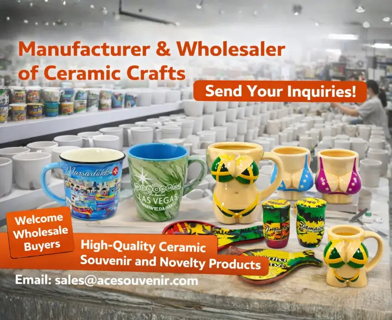 Just share your artworks or ideas, and our design team will bring them to life. From unique shapes to detailed logos, colors, and packaging, ACE Souvenir creates personalized polyresin crafts, ceramic items, and shot glasses that match your brand or market. We make customization simple, professional, and reliable—delivering products that sell.