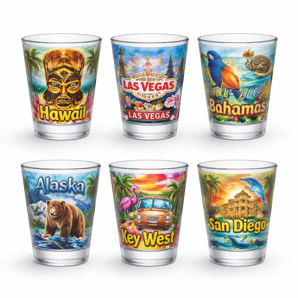 Custom printed glass shot glasses and ceramic mini mugs with destination themes.